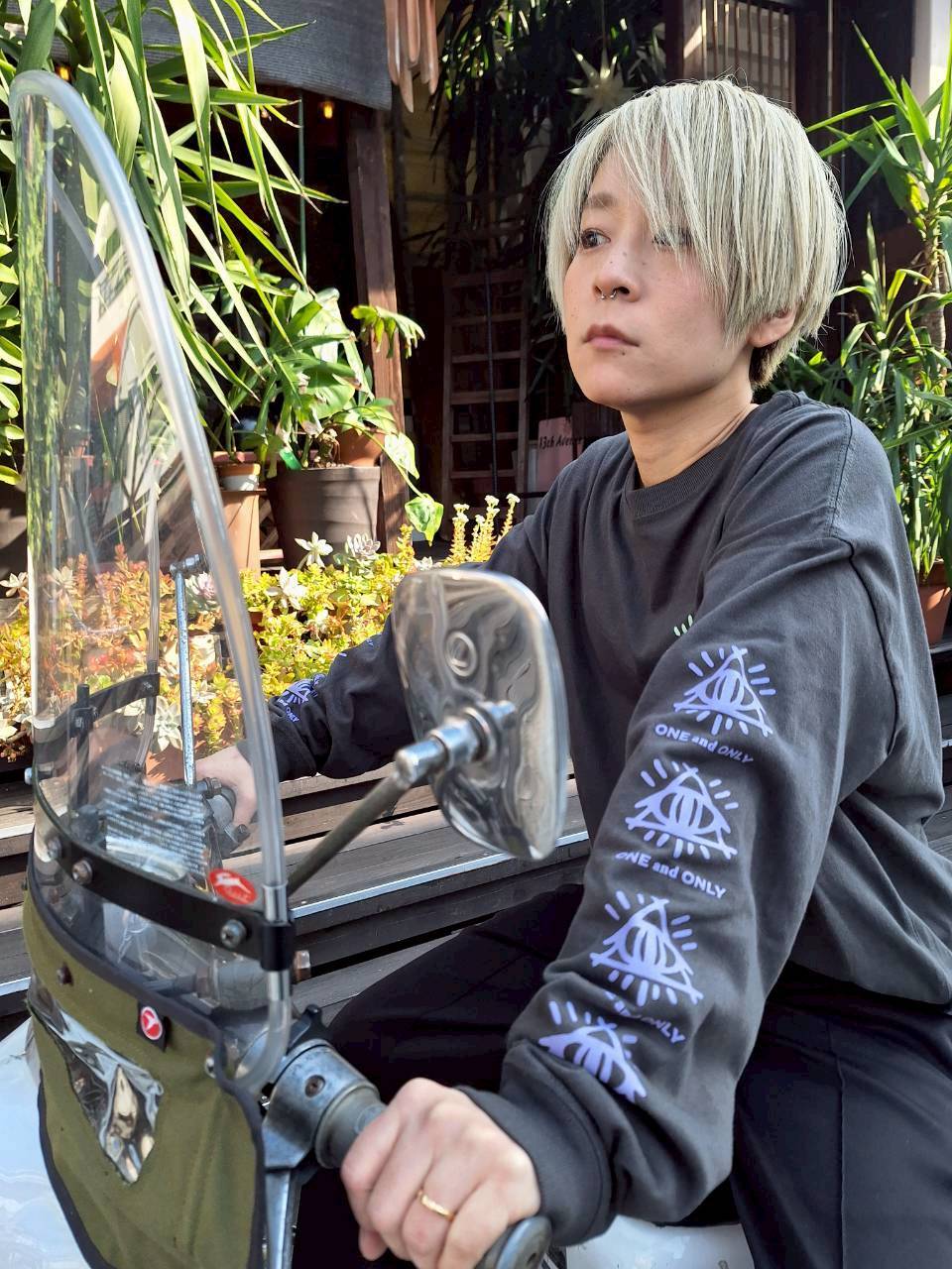 ベストや、半袖Tとの重ね着も楽しめる、ピラミッドアイを袖に配したクールモデル。